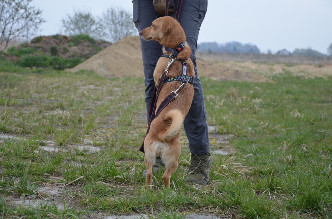 Honey pięknie chodzi na smyczy, robi to grzecznie i spokojnie - na spacerach korzysta, ile tylko może, z obecności człowieka, z tego że może się nim nacieszyć na wyłączność, bez reszty stęsknionych, skaczących skarbów - i często przychodzi po to, by oprzeć się o nas łapkami.