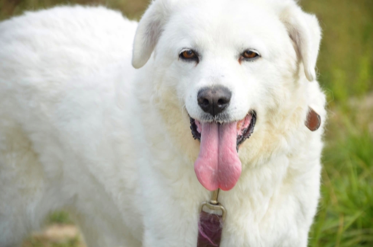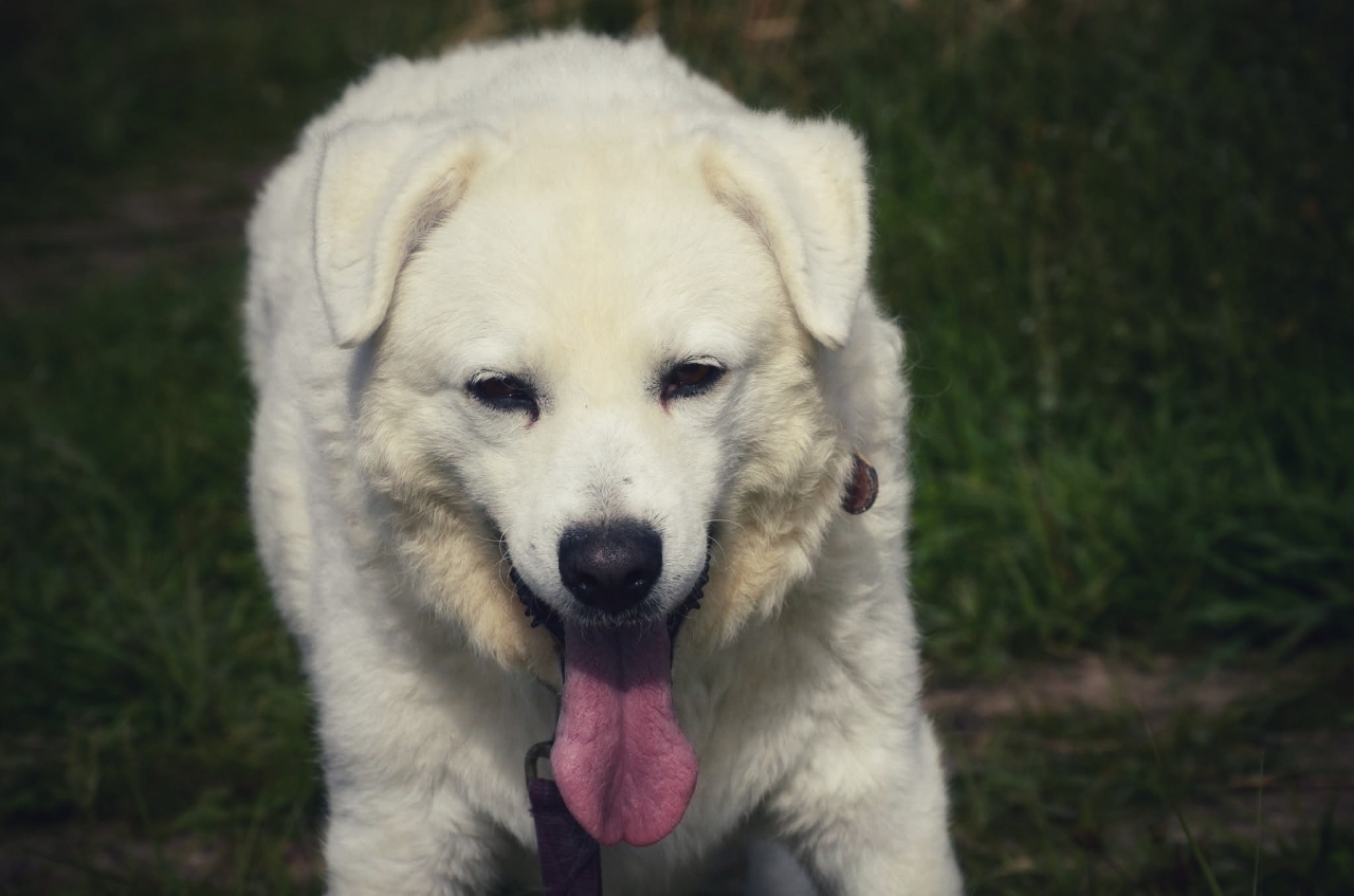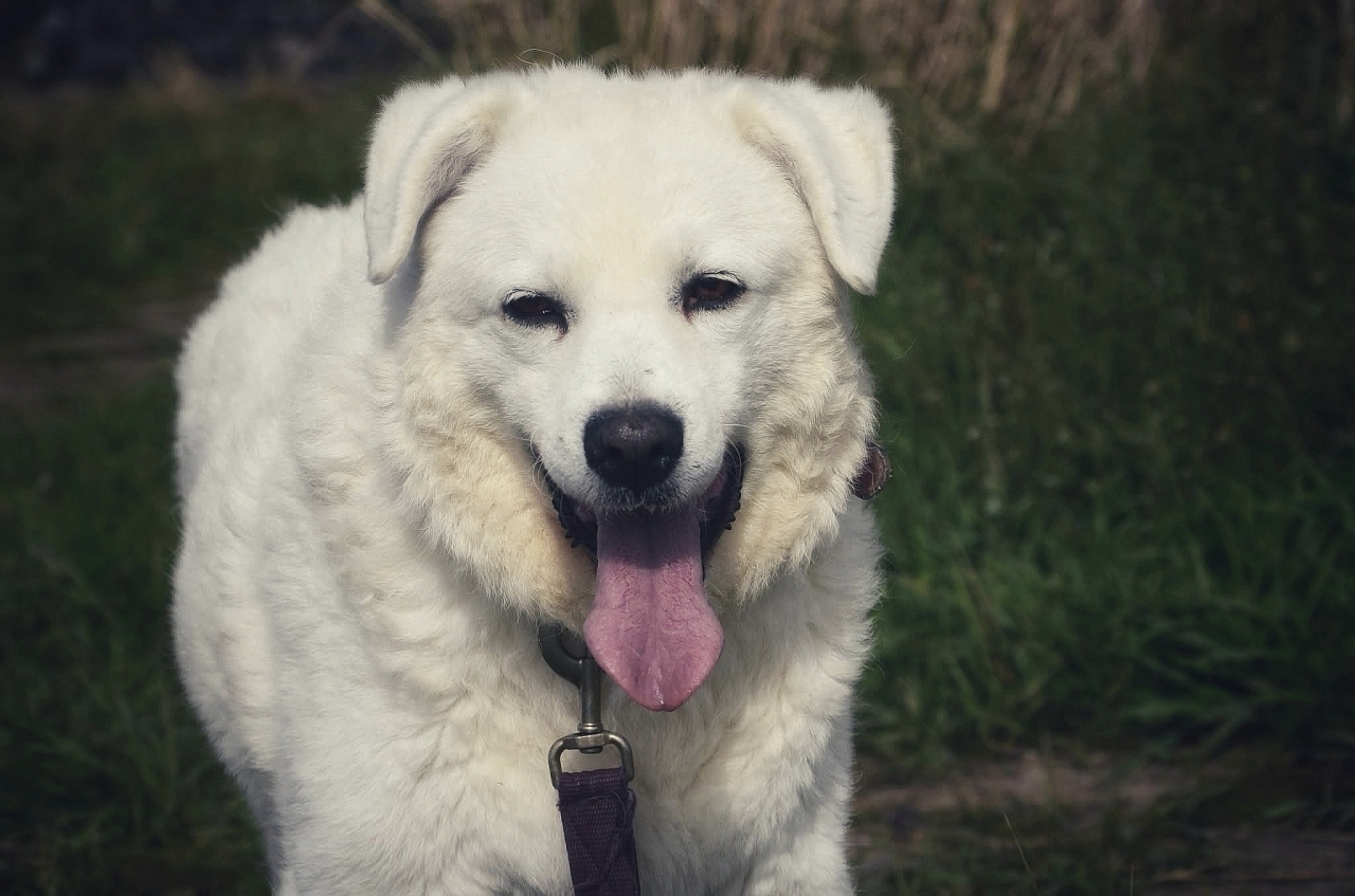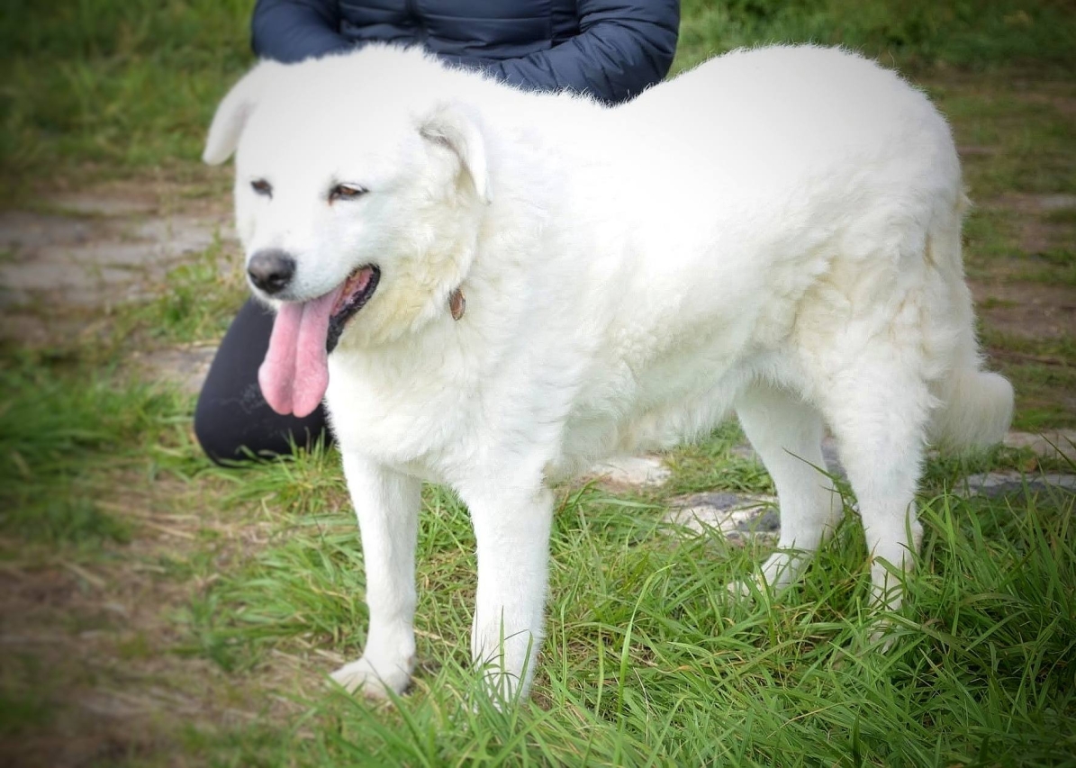 Mona jest przepięknym psem. Jej białe, puszyste futerko przyciąga wzrok każdego, ręce same wyciągają się żeby pogłaskać. Jest większym średniakiem - trochę powyżej kolana.