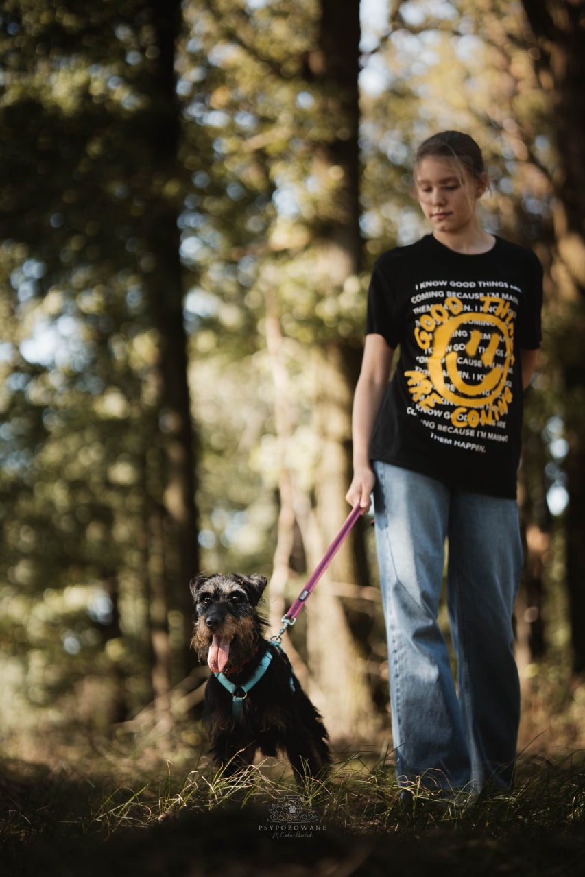 Na początku spaceru Twix bardzo ciągnie - ekscytuje się, wszystko chce zobaczyć, wszędzie być. Ale kiedy emocje trochę opadną, potrafi się pięknie uspokoić i skupić na opiekunie. Jest bardzo przytulaśny - kontakt z człowiekiem to dla niego ogromna radość!